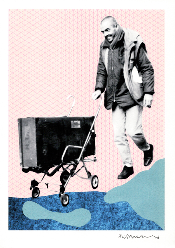I created this mixed-media work using a photograph I took on Brick Lane in the East End of London in the early 1980s. At that time many of the buildings along the lane were derelict or in serious disrepair. The man in the image has likely just bought the old suitcase at the Sunday market and is using a pushchair to transport it. Alternatively, he may have finished trying to sell the contents of the suitcase and is now heading home. Whatever the case, he appears quietly pleased with himself.