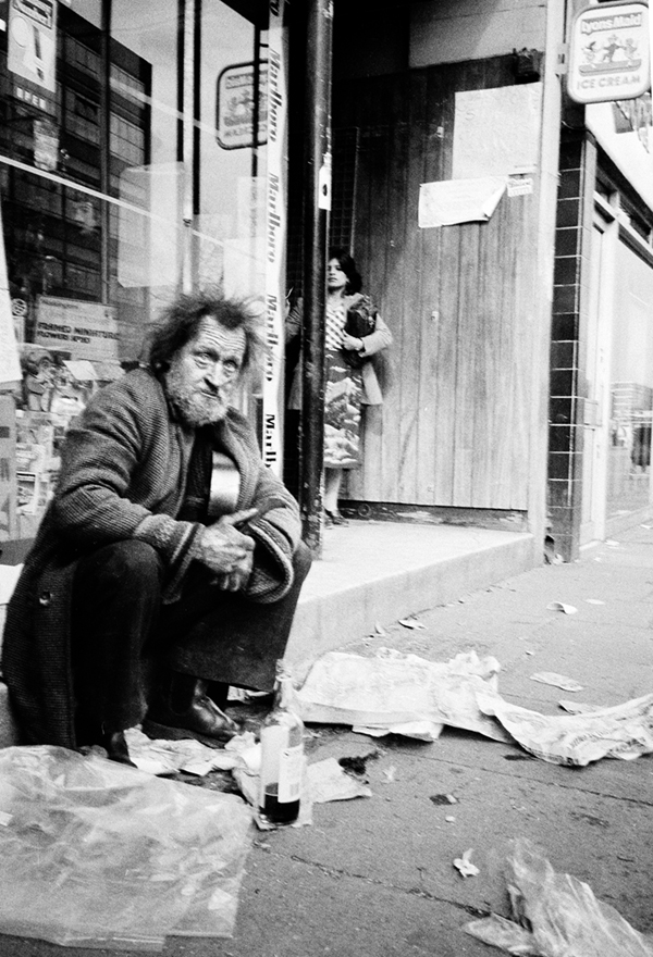 Having a rest on Whitechapel Road. East London, 1983.