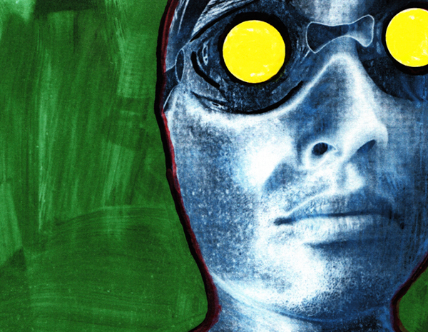The figure stands bare and frontal, neither posed nor protected. His chest is luminous and vulnerable, marked by an almost talismanic aperture—part wound, part portal. Yellow lenses flare where eyes should be, turning vision into heat, glare, desire. Behind him, a dense green ground presses forward, viscous and tidal, recalling algae or vegetation and refusing any sense of depth or escape.