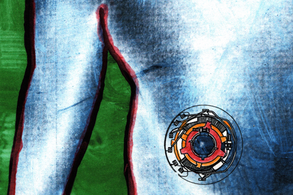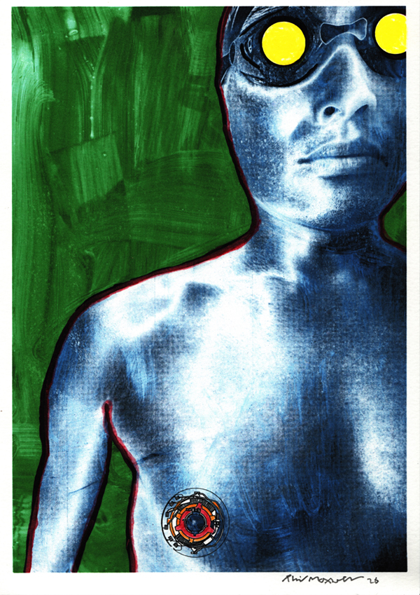 At this threshold, the work shifts. A schematic diagram of a cathode ray tube is drawn around his right nipple, introducing a technological incision into the flesh. The swimmer hovers between organism and apparatus, human and machine. In this fusion, the body becomes a metaphor for the future of the human race, prompting questions of extinction, obsolescence, and transformation: are we approaching our end, or merely being rewritten by artificial intelligence?