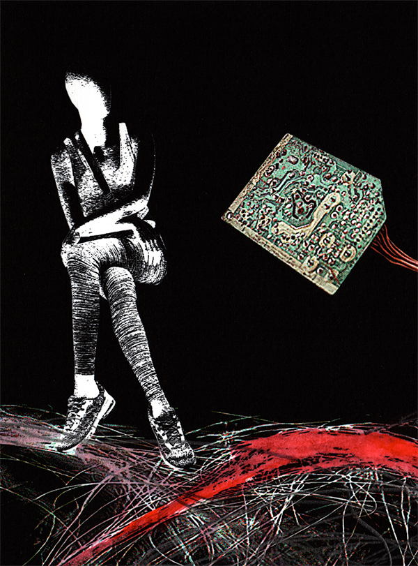 The closest I ever got to skateboarding was when I tried to ice skate once and fell over many times! I’ve always admired the freedom that skateboarding represents. Here the skateboarder is being pursued by a piece of electronic circuitry and watched by an anonymous robotic like figure. They both represent the algorhythms that pursue us throughout life and try to persuade us to buy stuff.